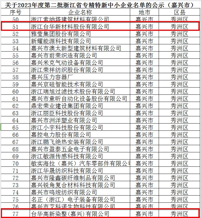 近日,嘉興市經(jīng)濟(jì)和信息化局發(fā)布了《關(guān)于2023年度第二批浙江省專精特新中小企業(yè)名單的公示(嘉興市)》,浙江臺(tái)華新材料股份有限公司和臺(tái)華高新染整(嘉興)有限公司上榜。