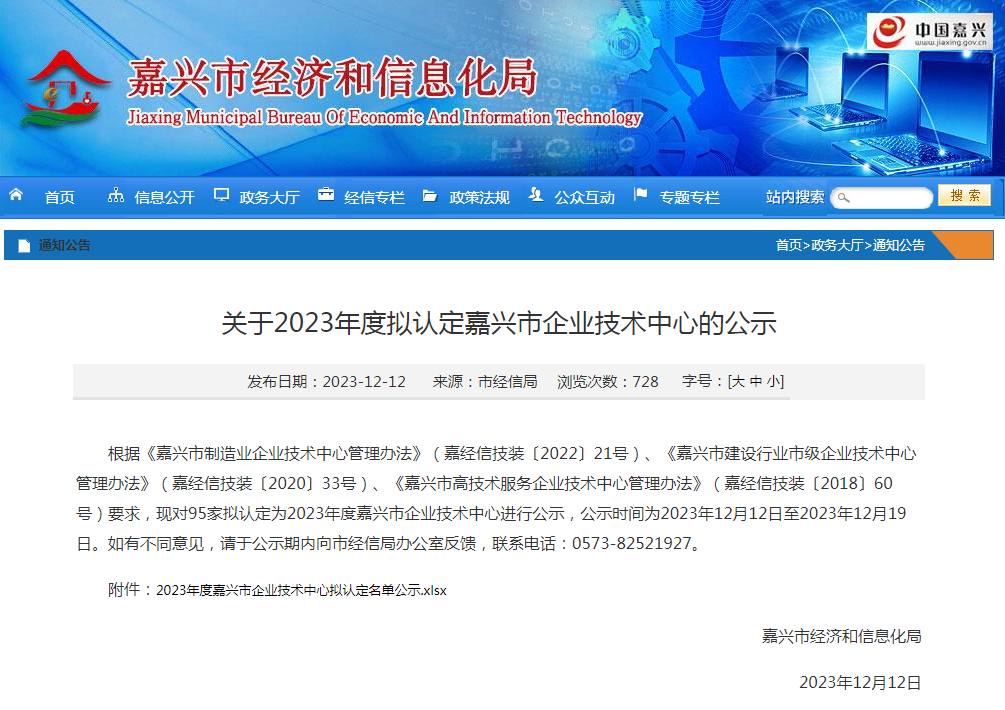 2023年12月12日,嘉興市經(jīng)濟(jì)和信息化局發(fā)布了《關(guān)于2023年度擬認(rèn)定嘉興市企業(yè)技術(shù)中心的公示》,對(duì)95家擬認(rèn)定為2023年度嘉興市企業(yè)技術(shù)中心進(jìn)行公示,浙江嘉華特種尼龍有限公司企業(yè)技術(shù)中心上榜。