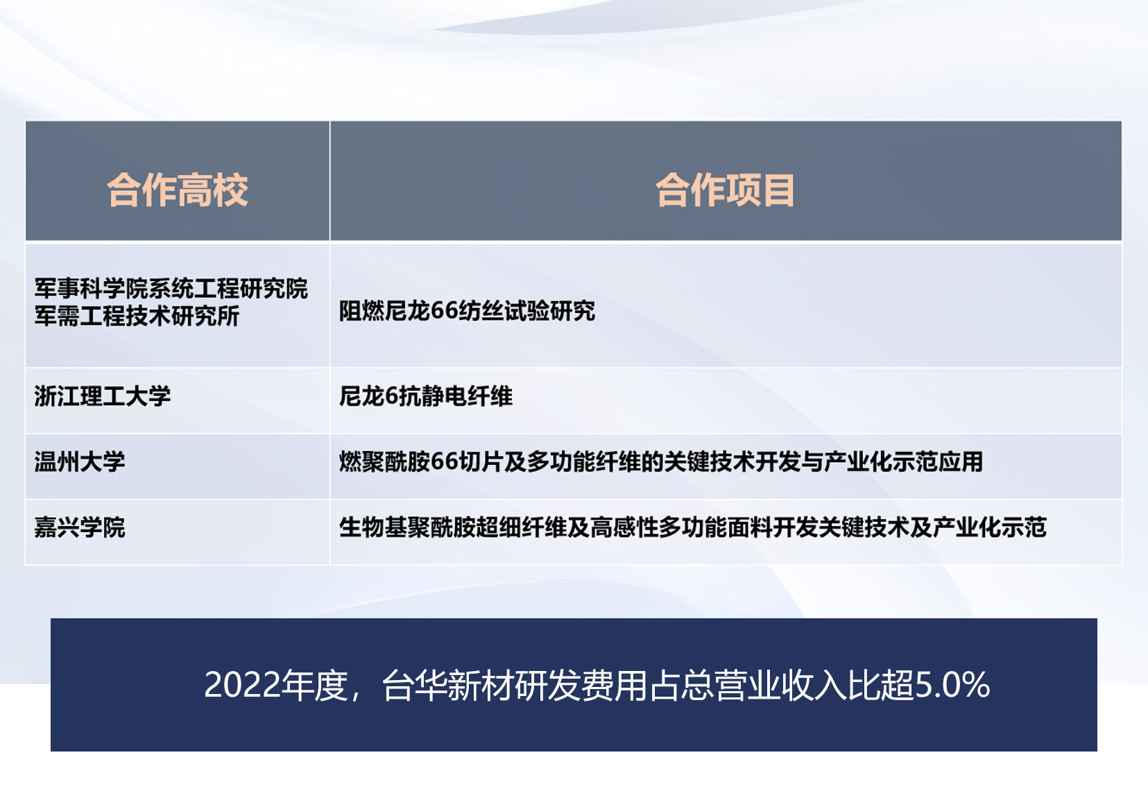 ?公司堅持走“產(chǎn)學(xué)研”合作的道路,公司“產(chǎn)學(xué)研”合作優(yōu)勢突出,與東華大學(xué)、浙江理工大學(xué)、長三角 (嘉興)納米科技產(chǎn)業(yè)發(fā)展研究院(國家納米科學(xué)中心嘉興分院)、嘉興大學(xué)等專業(yè)院校、研究所合作, 組成優(yōu)勢互補(bǔ)、產(chǎn)學(xué)研相結(jié)合的攻關(guān)隊伍,形成信息共享、基礎(chǔ)研究、技術(shù)攻關(guān)、技術(shù)推廣、 產(chǎn)業(yè)化應(yīng)用互相聯(lián)動的研發(fā)格局,共同承擔(dān)了多個項目。與東華大學(xué)、浙江理工大學(xué)、嘉興大學(xué)等形成長期性產(chǎn)學(xué)研合作。與美國杜邦、德國德司達(dá)、美國亨斯曼、德國巴斯夫、日本TMT、津田駒、日本大金、德國 巴馬格、德國門福士、美國3M等業(yè)內(nèi)的專家進(jìn)行技術(shù)交流,開發(fā)高新技術(shù)產(chǎn)品及國際流行產(chǎn)品。
