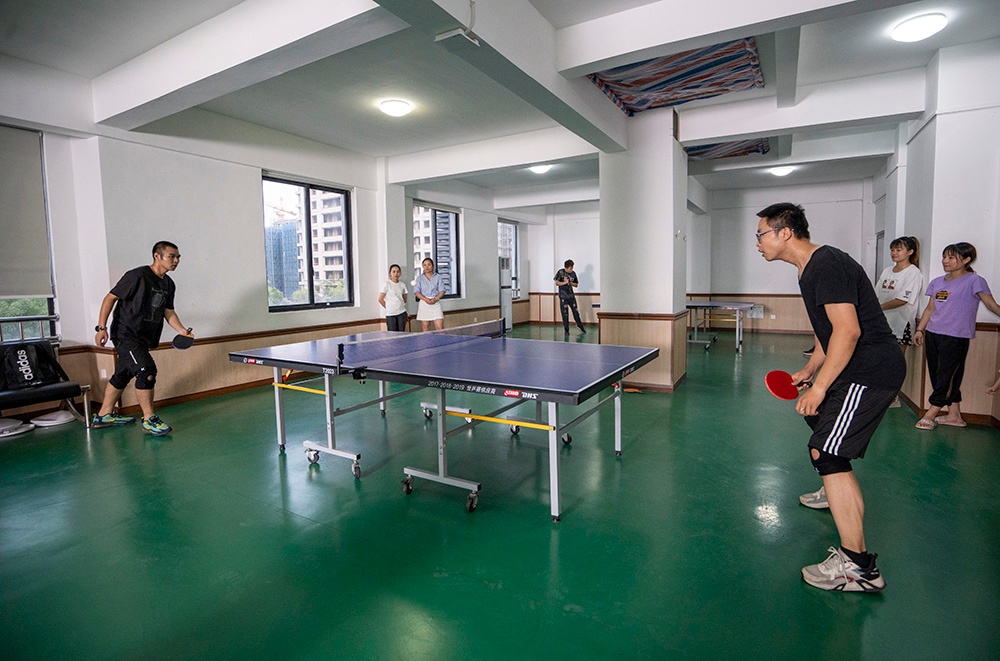 公司自建生活小區(qū),員工宿舍有套房(兩室一廳)、單人間以及集體宿舍等不同房型,房間內(nèi)設(shè)空調(diào)、熱水淋浴、衣柜、床鋪等設(shè)施,滿(mǎn)足員工基本需求。生活小區(qū)還提供閱覽室、籃球場(chǎng)、臺(tái)球室等,并緊鄰?fù)醯昝繁惫珗@,給臺(tái)華家人們提供不同的休閑方式。